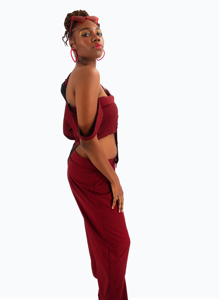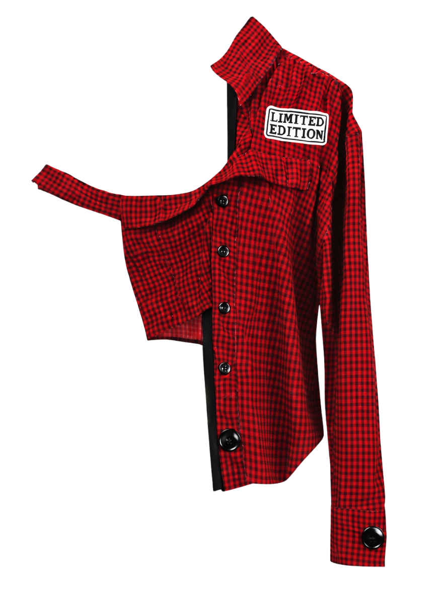 A deconstructed gingham statement with an off-shoulder cut and sharp tailoring—sweet, subversive, and unmistakably Autumn Foxx. Finished with black buttons and a Limited Edition patch for that collector-piece energy.