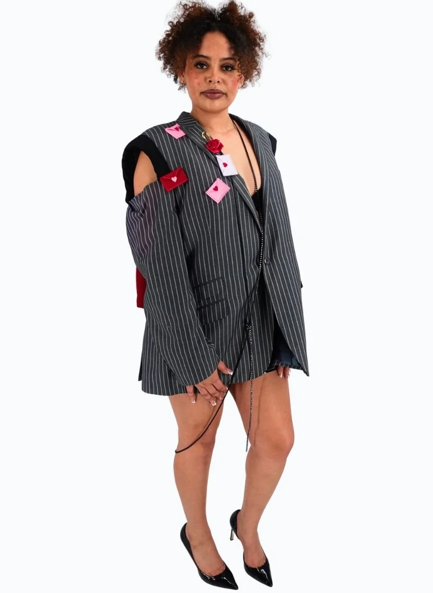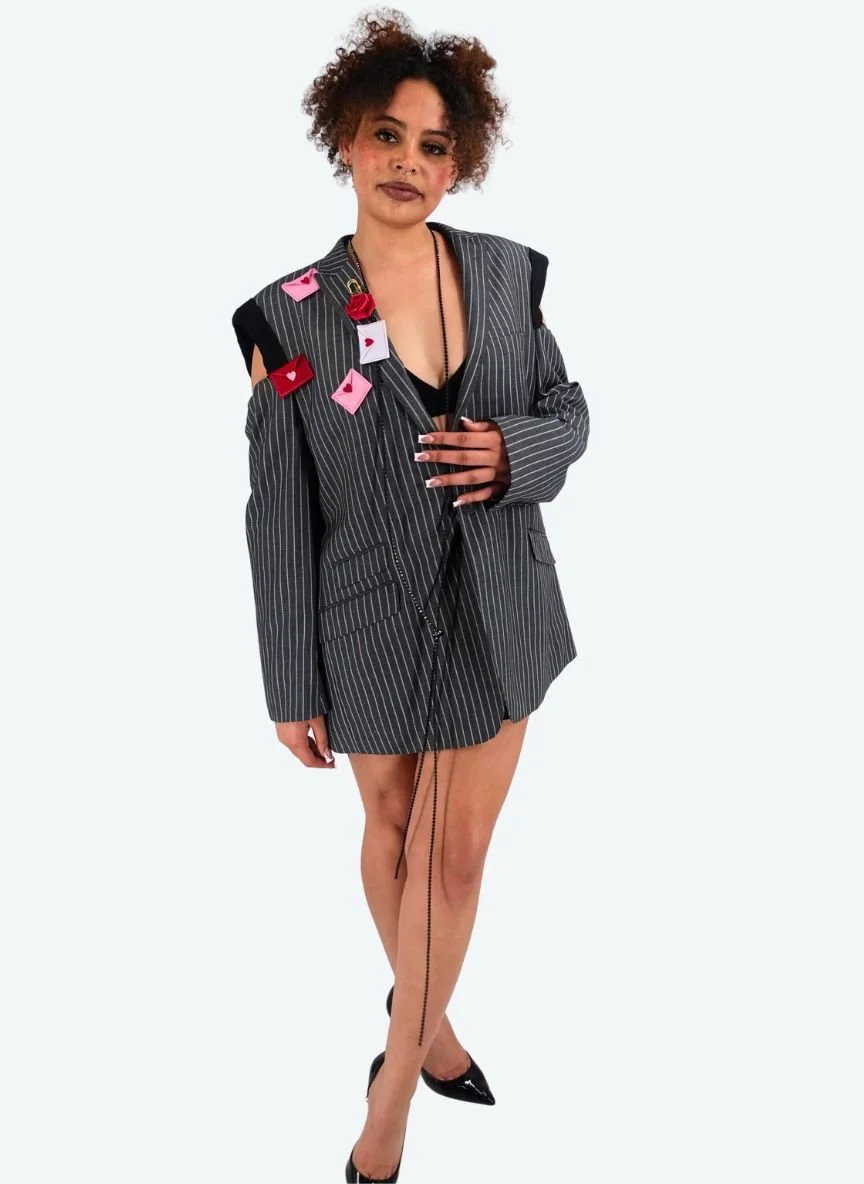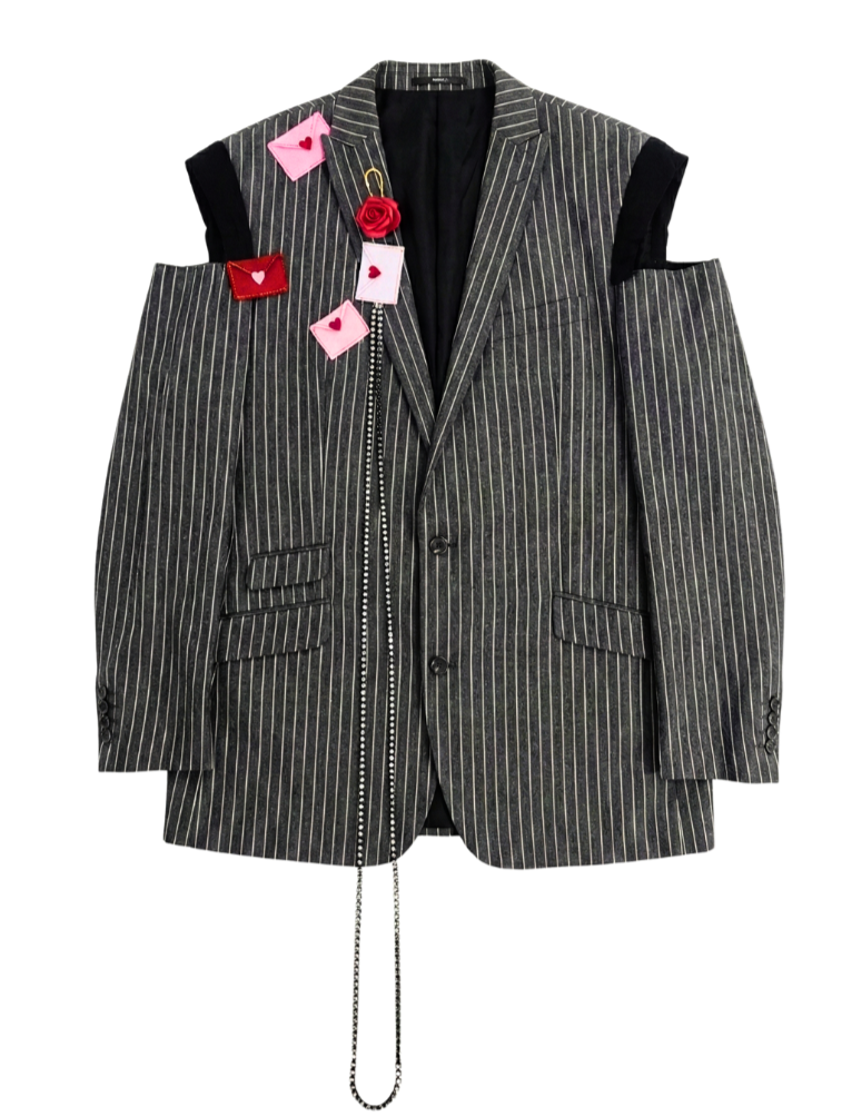 A deconstructed pinstripe blazer with open-shoulder attitude and “love note” details pinned like a secret you weren’t supposed to see. Finished with rhinestone zip sparkle and a chain drop for full after-hours power-suit energy